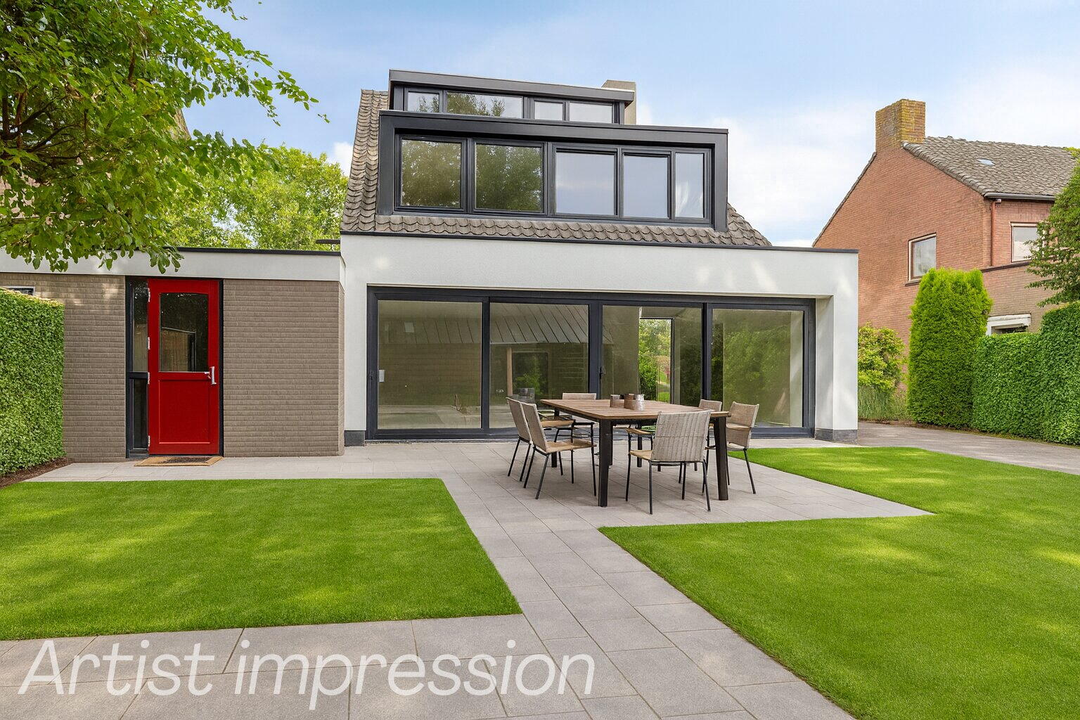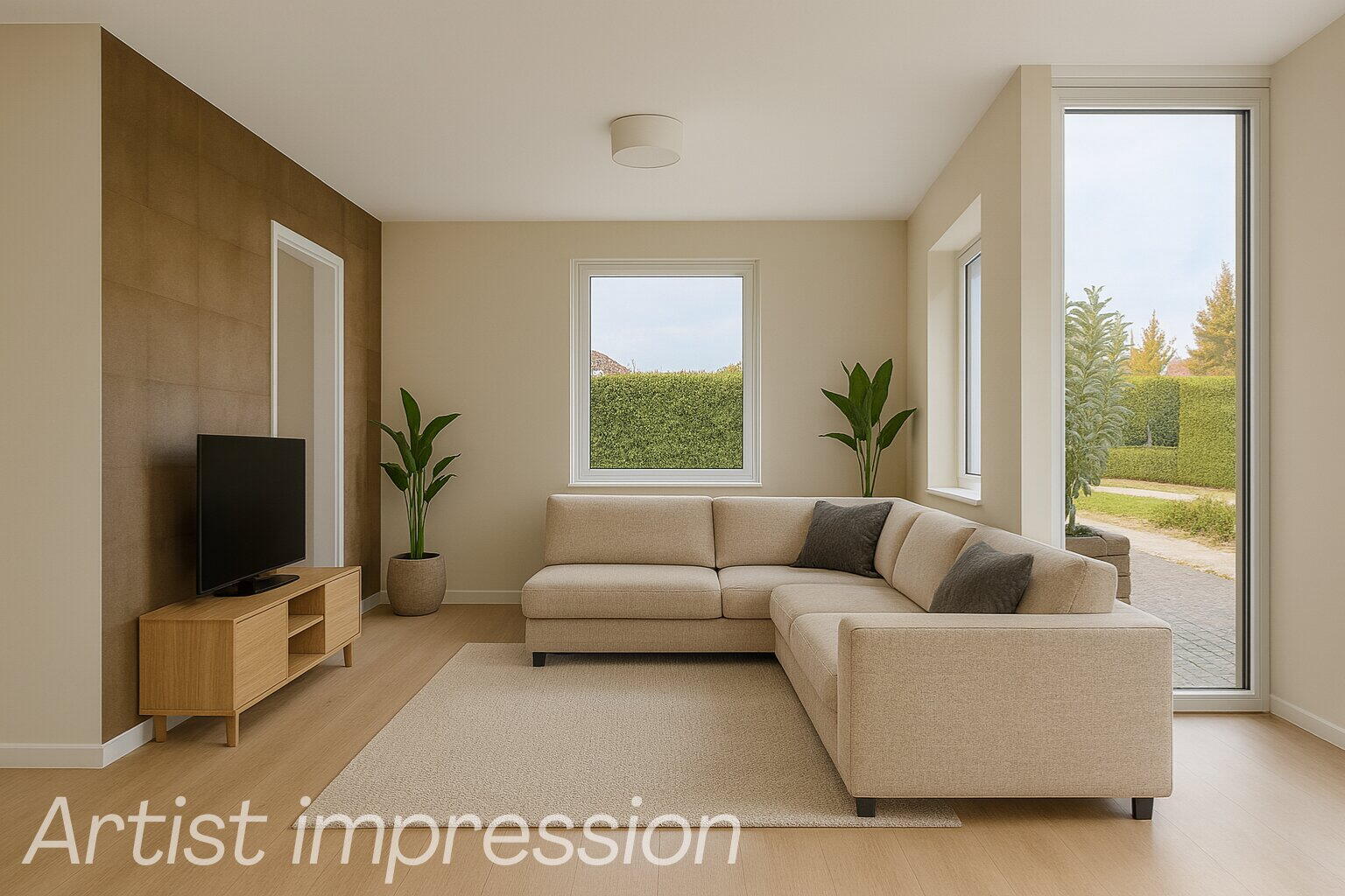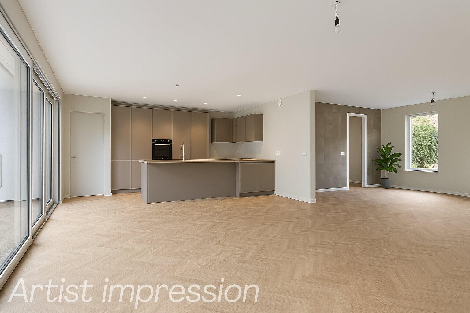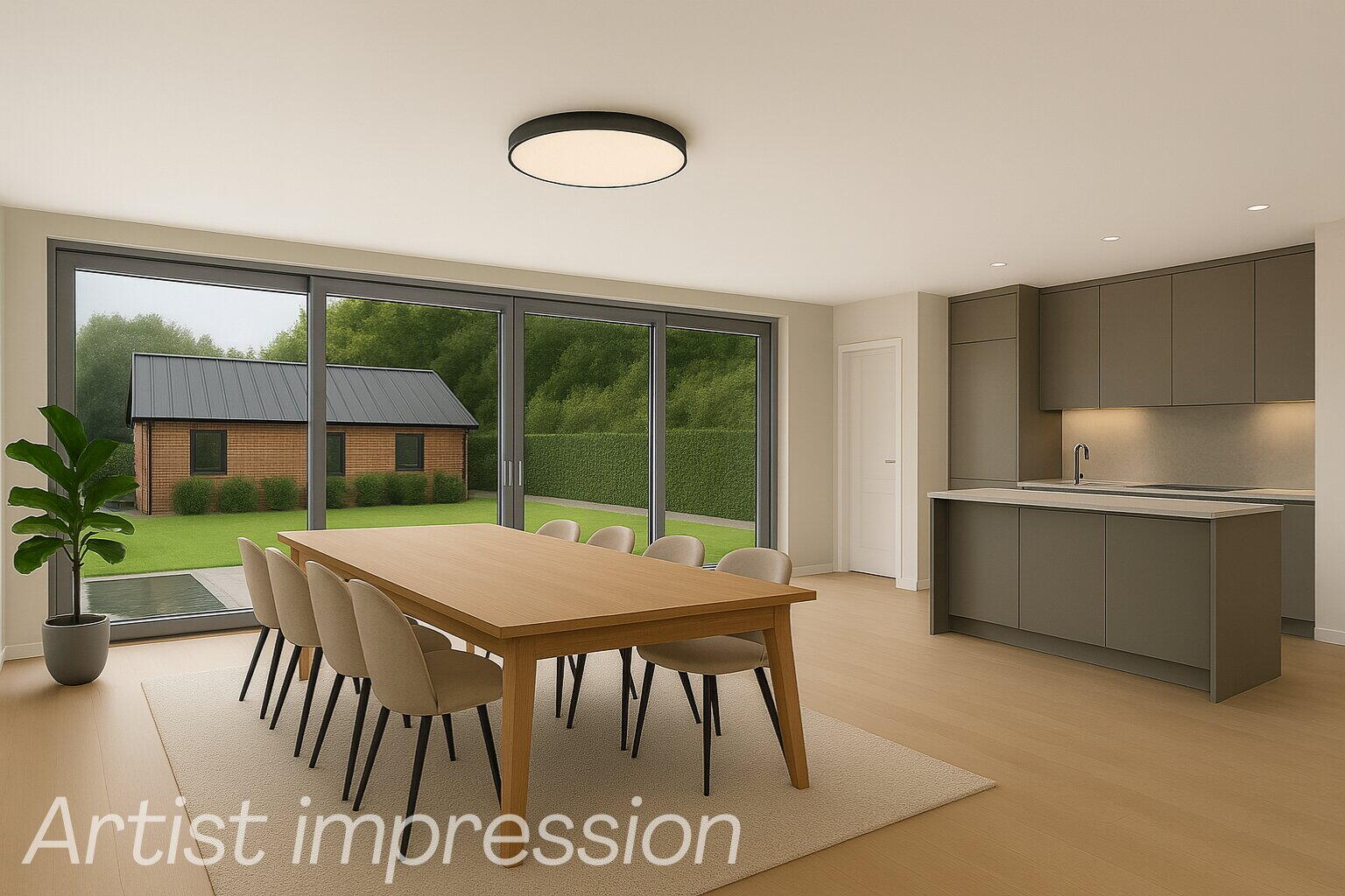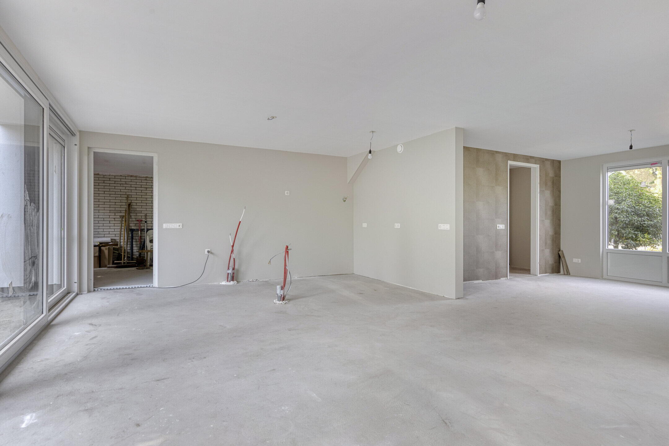 De woonkamer voelt direct groots aan door de enorme schuifpui aan de achterzijde. Hier vloeien tuin en interieur moeiteloos samen. De open leefkeuken grenst aan de garage en wacht op jouw persoonlijke touch. Van strak modern tot warm landelijk, alles is mogelijk.