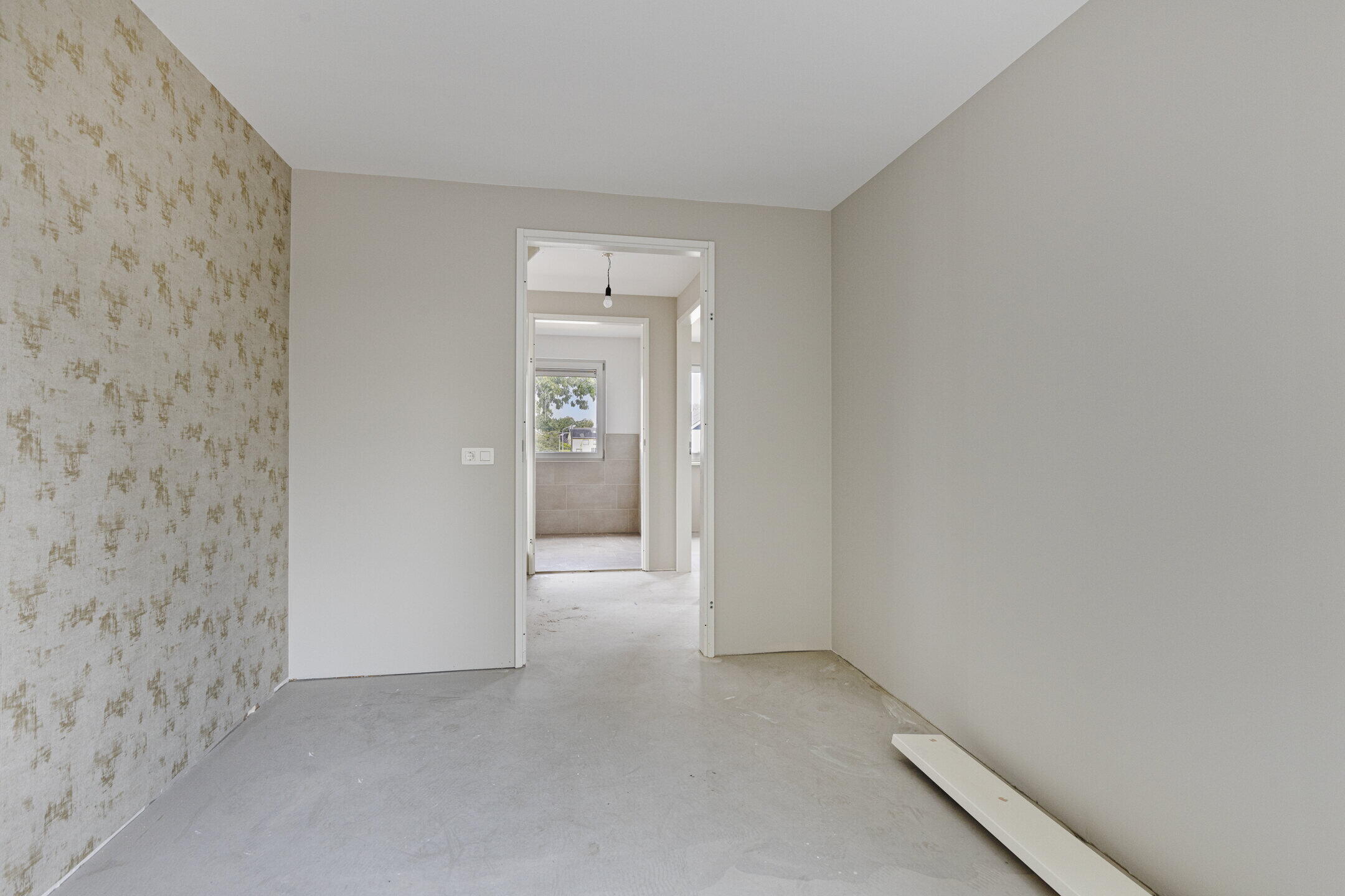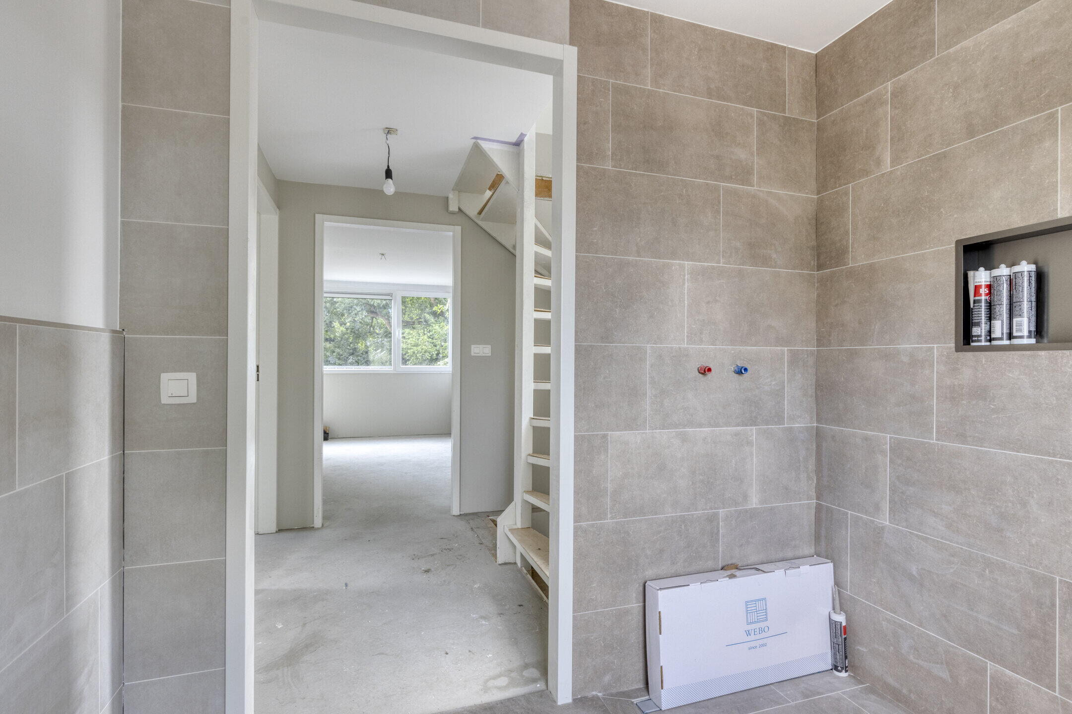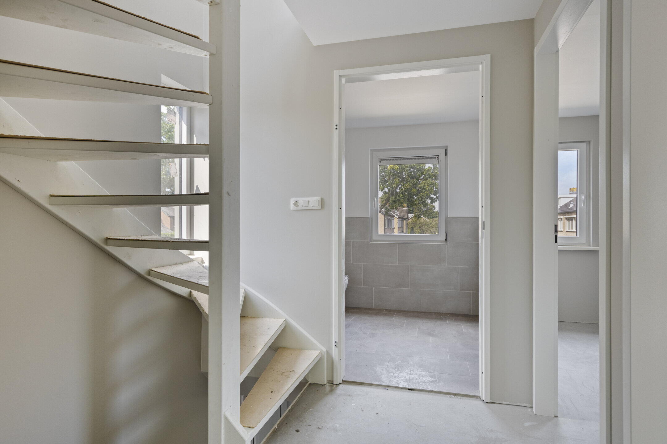 Ook boven staat de basis als een huis. Strak gestucte slaapkamers met veel daglicht dankzij de brede dakkapellen aan de achterzijde. De badkamer is voorbereid met aansluitingen voor douche en wastafel, voorzien van stijlvolle beige tegels en een toilet.