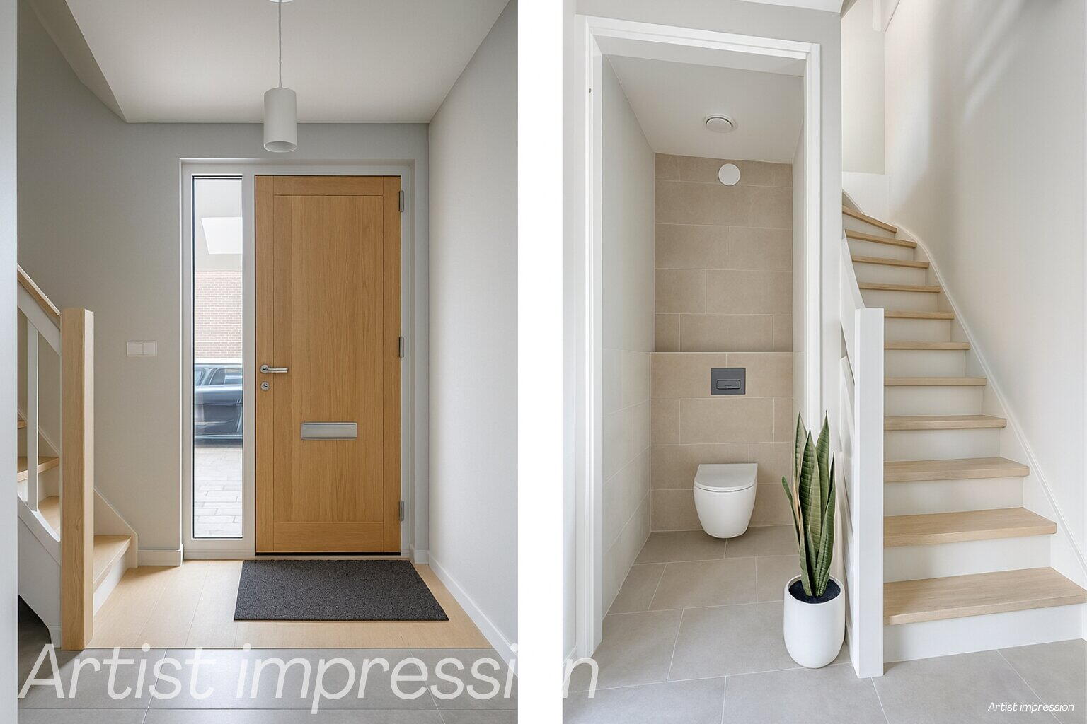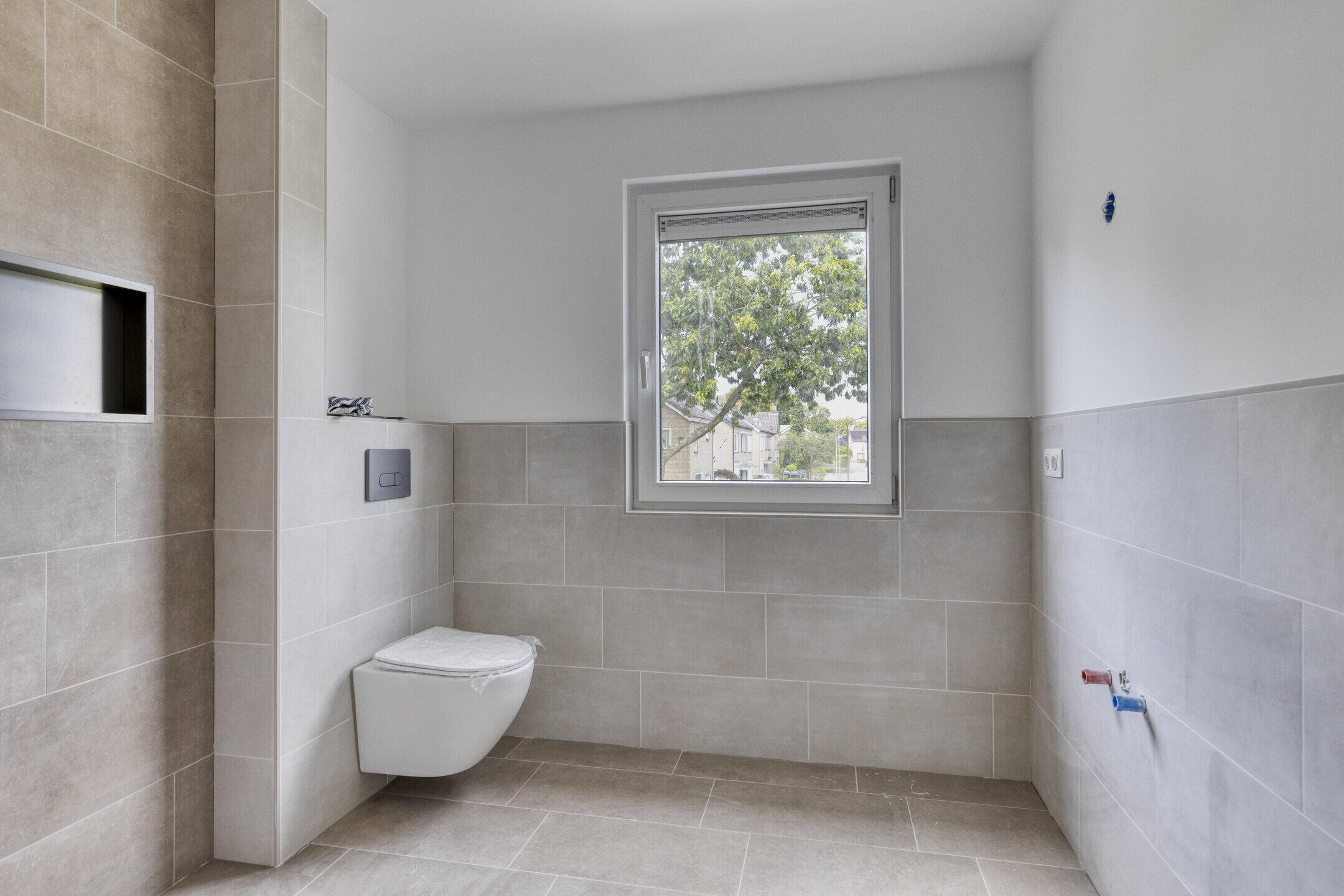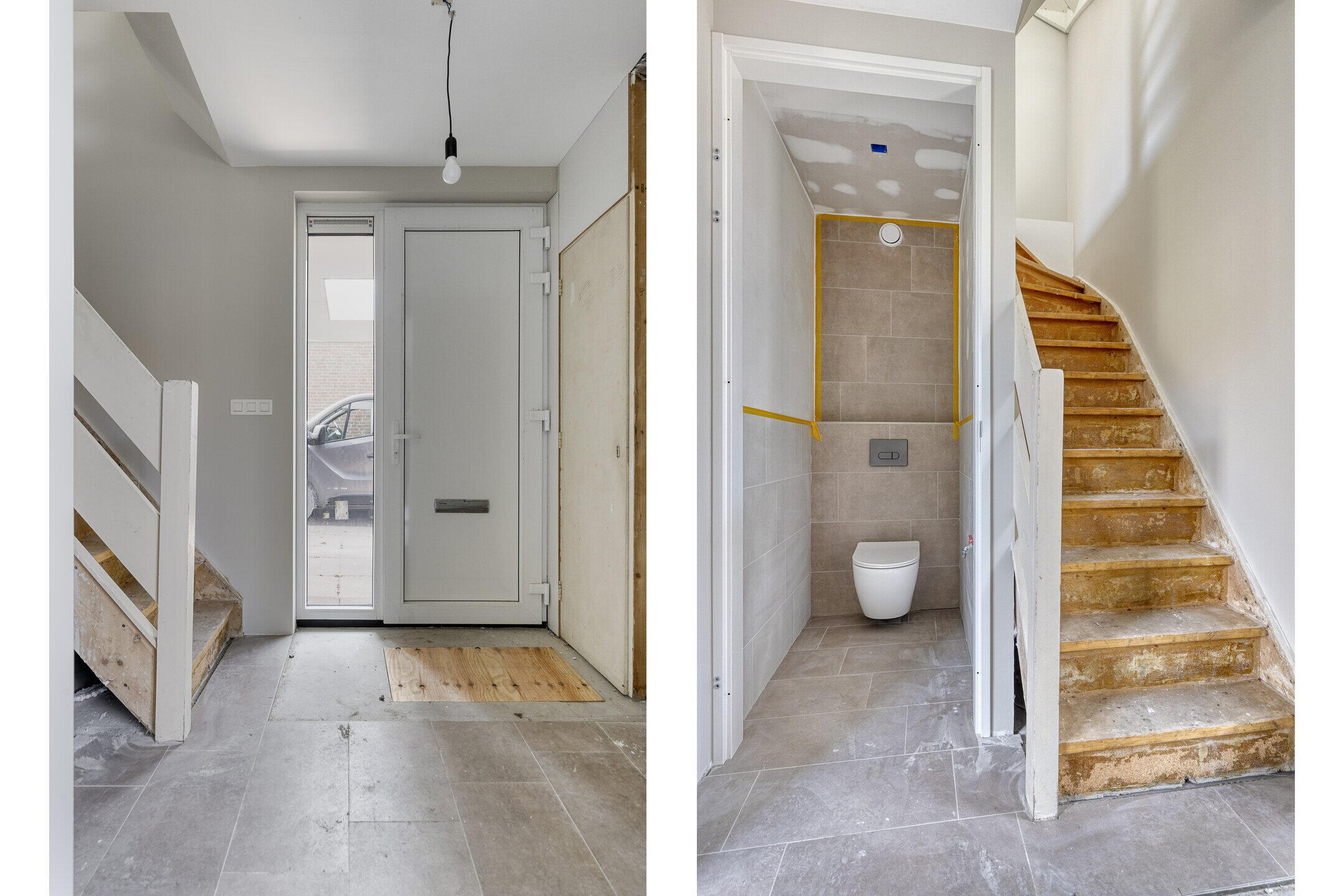 Ook boven staat de basis als een huis. Strak gestucte slaapkamers met veel daglicht dankzij de brede dakkapellen aan de achterzijde. De badkamer is voorbereid met aansluitingen voor douche en wastafel, voorzien van stijlvolle beige tegels en een toilet.