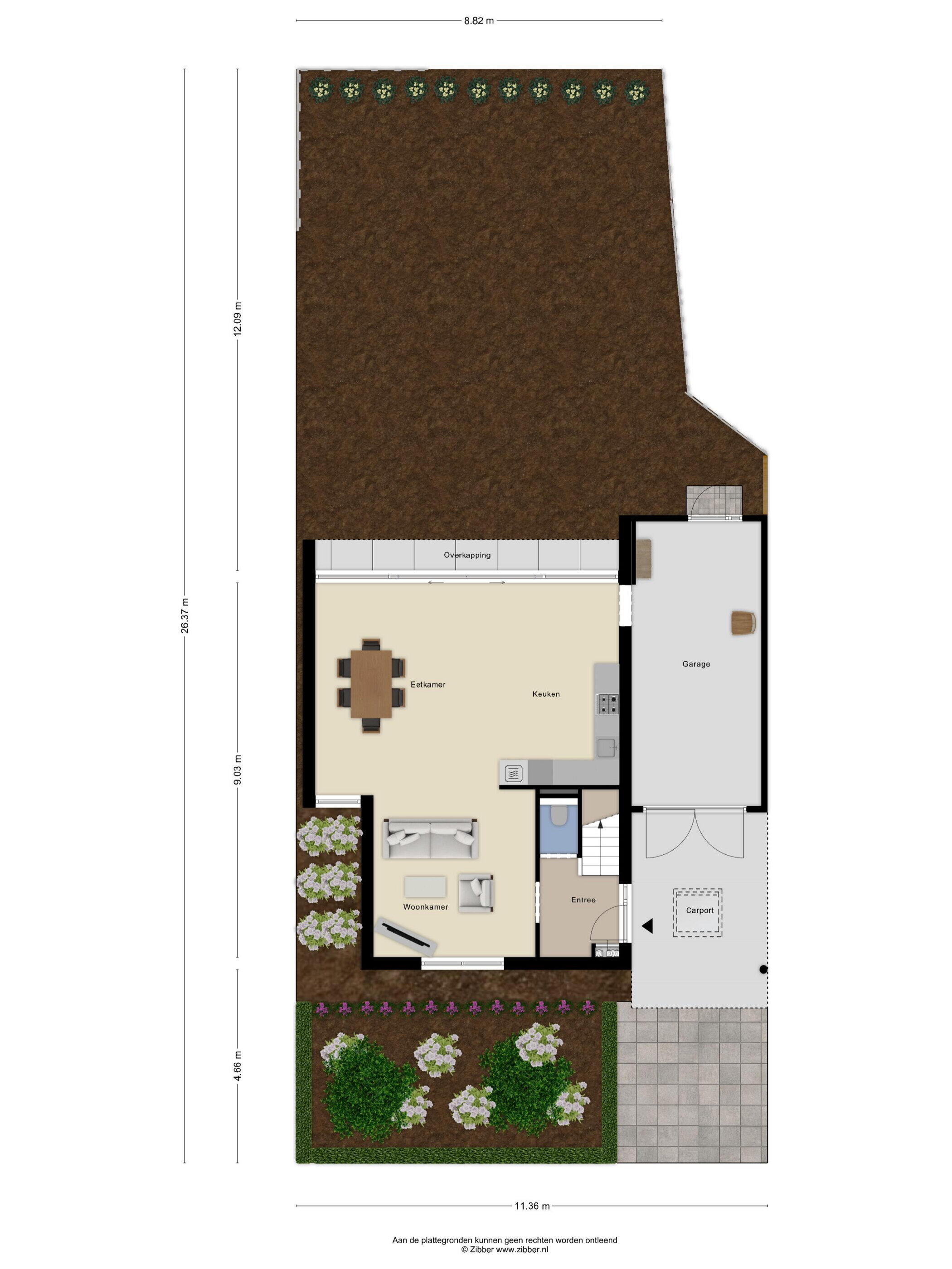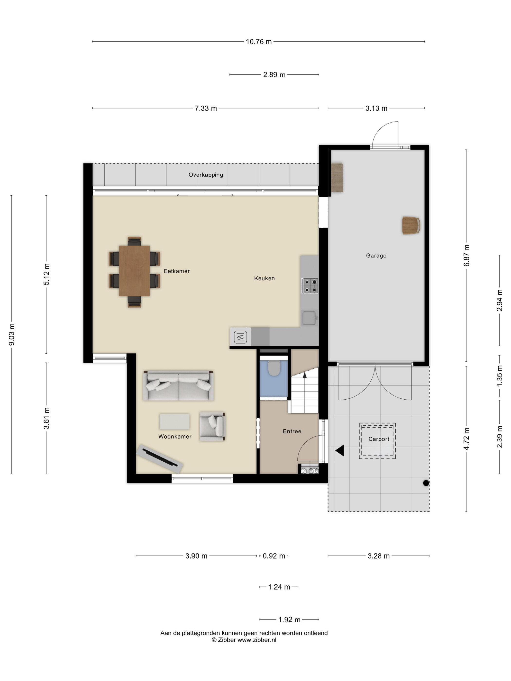 Onder de carport parkeer je de auto droog en comfortabel. Via de hal, met toegang tot het toilet, de meterkast en de trap naar de eerste verdieping, loop je zo de lichte woonkamer in.